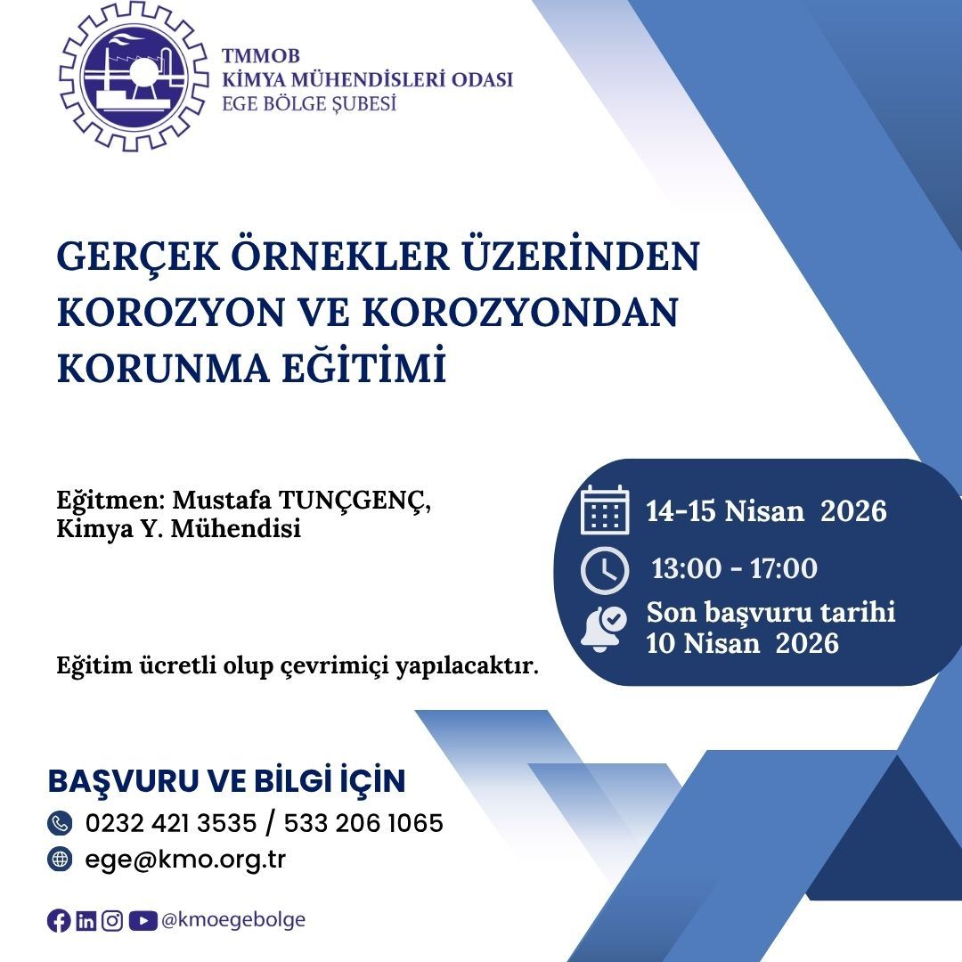 14-15 Nisan 2026 tarihlerinde “GERÇEK ÖRNEKLER ÜZERİNDEN KOROZYON VE KOROZYONDAN KORUNMA EĞİTİMİ” Zoom uygulaması üzerinden online olarak düzenlenecektir.