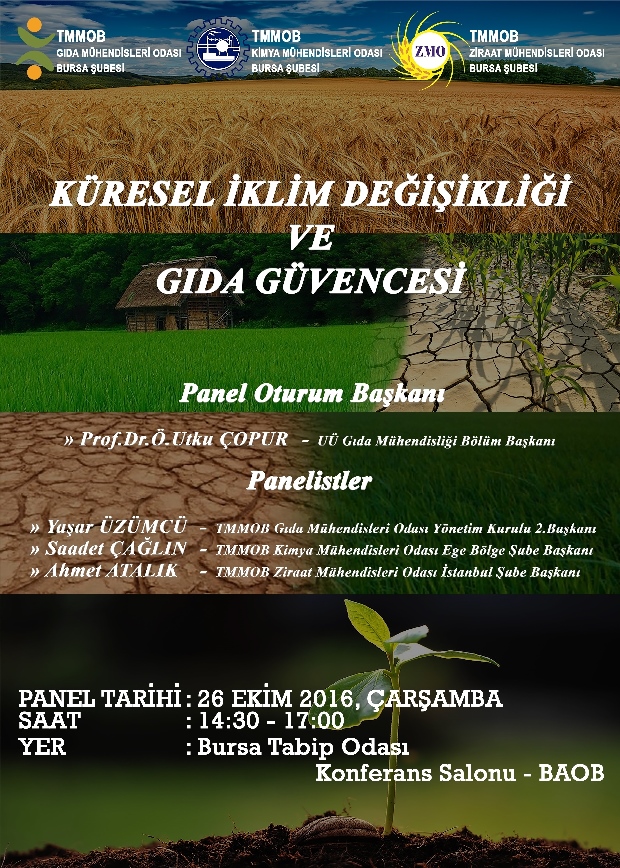 TMMOB Gıda-Kimya-Ziraat Mühendisleri odalarımız tarafından 26 Ekim 2016 Çarşamba günü saat : 14.30-17.00 da Bursa Tabip Odası Konferans salonunda düzenlenecek olan "Küresel İklim Değişikliği ve Gıda Güvencesi" paneli düzenlenecektir.
