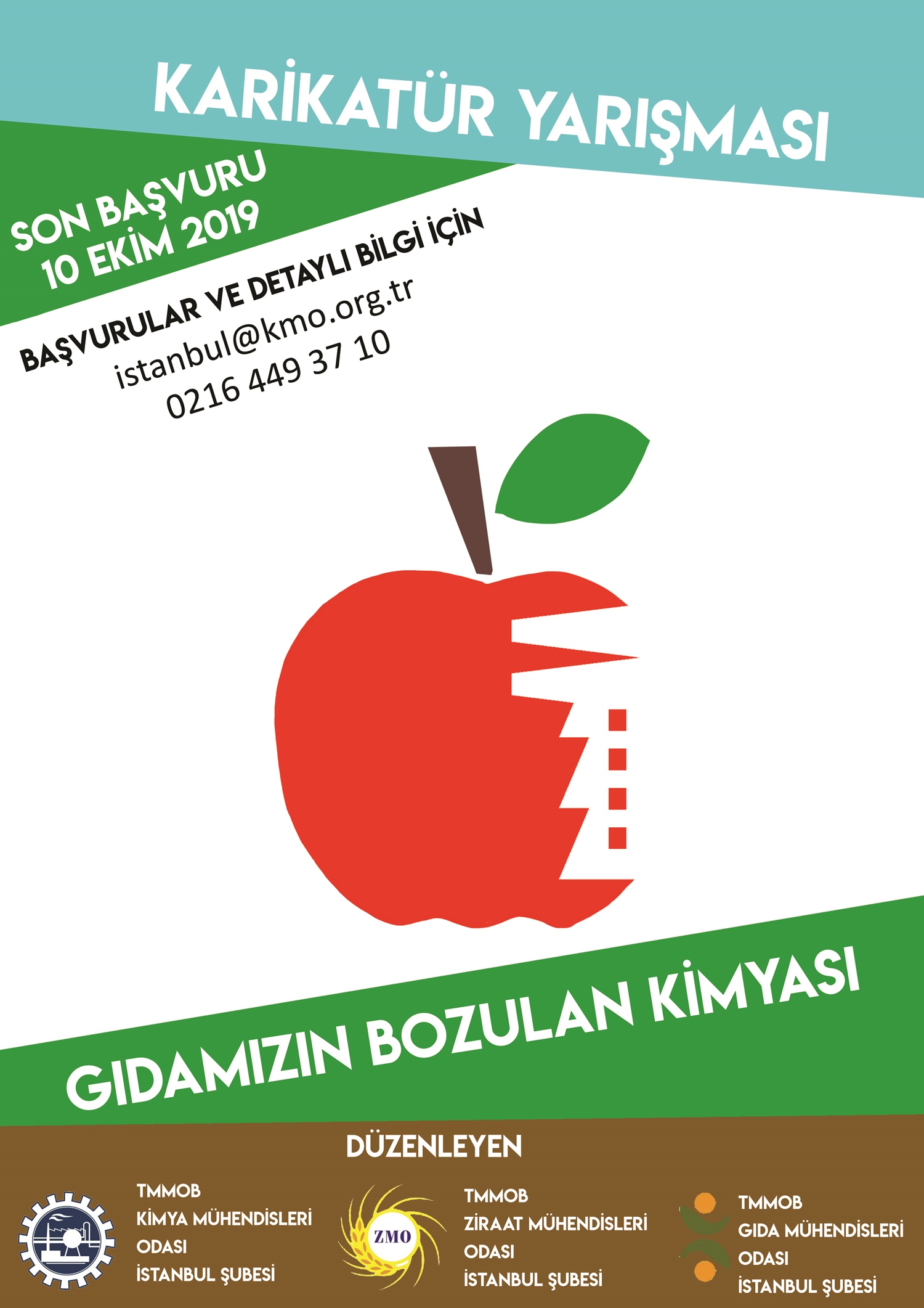TMMOB Kimya, Ziraat ve Gıda Mühendisleri İstanbul Şubeleri olarak ortaklaşa düzenlediğimiz `Gıdamızın Bozulan Kimyası` konulu karikatür yarışmamıza başvurular başlamıştır. Başvurular 10 Ekim 2019 tarihinde sonlanacaktır.