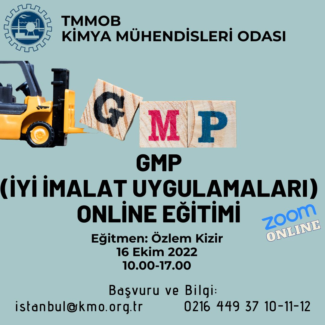 16 Ekim 2022 Pazar günü GMP (İyi İmalat Uygulamaları) Eğitimi online olarak zoom programı üzerinde düzenlenecektir. Eğitim ile ilgili detaylı bilgi aşağıda yer almakta olup eğitim başvuru formunu ekte dosyalar kısmında bulabilirsiniz.