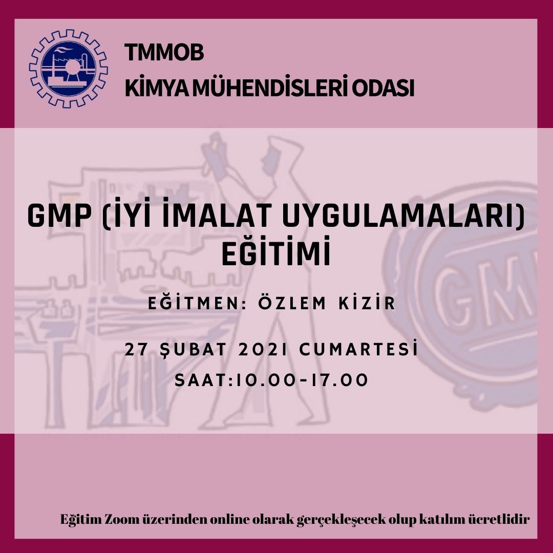 27 Şubat 2021 tarihinde GMP (İyi İmalat Uygulamaları) Eğitimi online olarak zoom programı düzenlenecektir. Eğitim ile ilgili detaylı bilgi aşağıda yer almakta olup eğitim başvuru formunu dosyalar kısmında bulabilirsiniz.