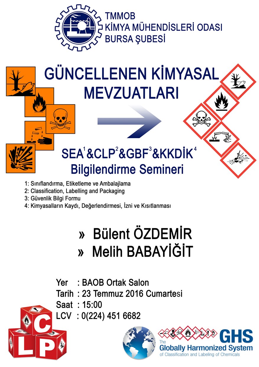 2015 yılında güncellenen ve 2016 yılında yürürlüğe giren yeni "Güvenlik Bilgi Formları -GBF" ve "Sınıflandırma Etiketleme ve Ambalajlama - SEA" mevzuatları konusunda ulusal ve uluslararası yönetmelik değişikliklerini ve Kimya sektörü profesyoneli olarak bizlerin bilmesi gereken teknik ve ticari bilgilerin aktarılacağı "Güncellenen Kimyasal Mevzuatları Bilgilendirme Semineri" 23 Temmuz 2016 Cumartesi saat 15.00da BAOB Ortak Toplantı salonunda ücretsiz olarak düzenlenecektir.