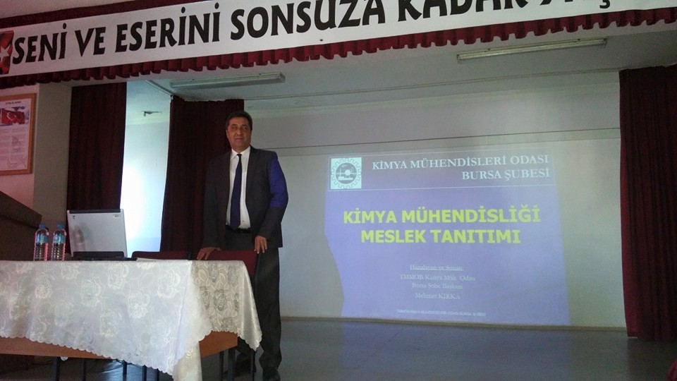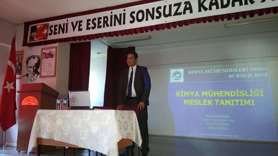 18 Kasım 2015 tarihinde, Gürsu IMKB Anadolu Lisesi öğrencilerine Kimya Mühendisliği mesleği, çalışma alanları, üniversite seçimleri ve Odamız, hakkında şube başkanımız Mehmet Kırka tarafından meslek tanıtımı ve bilgilendirme yapılmıştır.