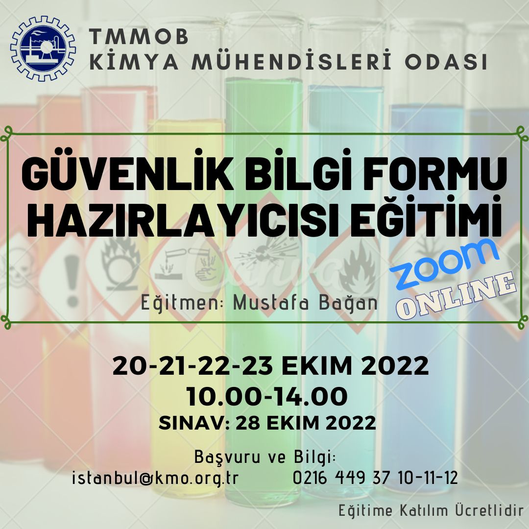 Odamız tarafından 20-21-22-23 Ekim 2022 tarihlerinde GÜVENLİK BİLGİ FORMU HAZIRLAYICISI EĞİTİMİ düzenlenecektir. Zoom programı üzerinden online olarak yapılacak eğitim ile ilgili detaylı bilgi ekte/aşağıda yer almaktadır. Eğitime katılmak isteyenlerin, başvuru formunu doldurarak istanbul@kmo.org.tr e-posta adresine göndermeleri rica olunur.