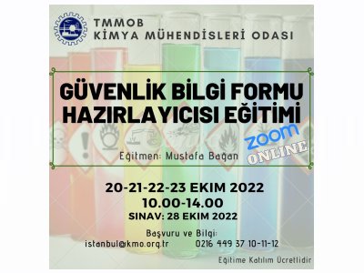 Odamız tarafından 20-21-22-23 Ekim 2022 tarihlerinde GÜVENLİK BİLGİ FORMU HAZIRLAYICISI EĞİTİMİ düzenlenecektir. Zoom programı üzerinden online olarak yapılacak eğitim ile ilgili detaylı bilgi ekte/aşağıda yer almaktadır. Eğitime katılmak isteyenlerin, başvuru formunu doldurarak istanbul@kmo.org.tr e-posta adresine göndermeleri rica olunur.