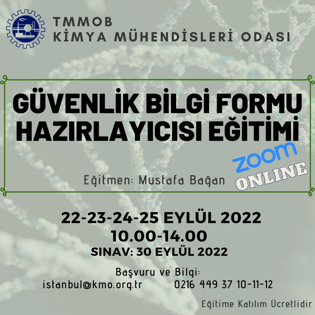 Odamız tarafından 22-23-24-25 Eylül 2022 tarihlerinde GÜVENLİK BİLGİ FORMU HAZIRLAYICISI EĞİTİMİ düzenlenecektir. Zoom programı üzerinden online olarak yapılacak eğitim ile ilgili detaylı bilgi aşağıda yer almaktadır. Eğitime katılmak isteyenlerin, başvuru formunu doldurarak istanbul@kmo.org.tr e-posta adresine göndermeleri rica olunur.