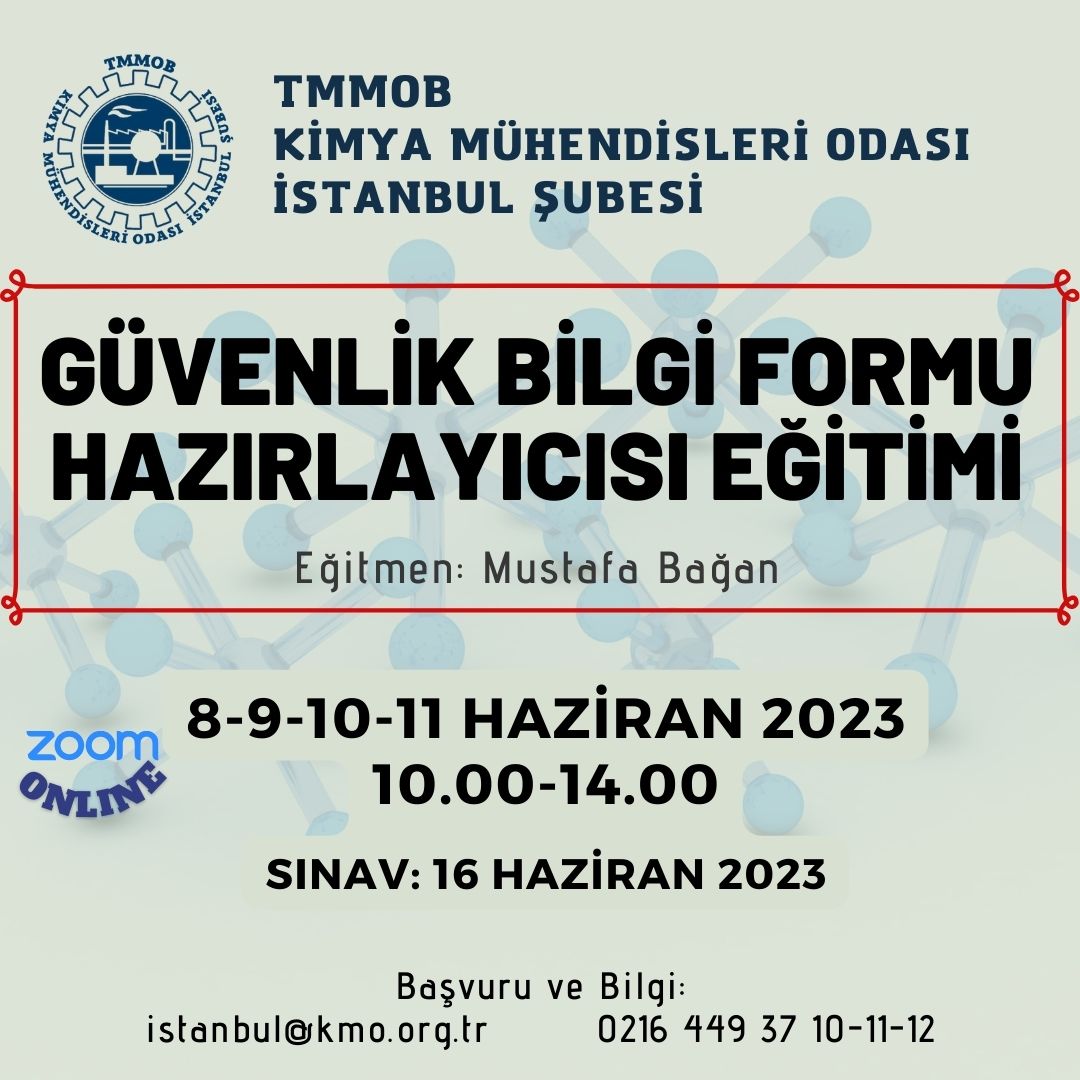 Odamız tarafından 8-9-10-11 Haziran 2023 tarihlerinde GÜVENLİK BİLGİ FORMU HAZIRLAYICISI EĞİTİMİ düzenlenecektir. Zoom programı üzerinden online olarak yapılacak eğitim ile ilgili detaylı bilgi aşağıda yer almaktadır. Eğitime katılmak isteyenlerin, başvuru formunu doldurarak istanbul@kmo.org.tr e-posta adresine göndermeleri rica olunur.