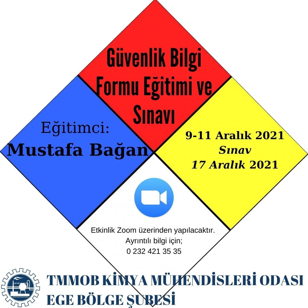 TMMOB Kimya Mühendisleri Odası Ege Bölge Şubesi, 09-10-11-12 Aralık 2021 tarihlerinde GÜVENLİK BİLGİ FORMU HAZIRLAYICISI EĞİTİMİ‘ni düzenleyecektir. Zoom programı üzerinden online olarak yapılacak eğitim ile ilgili detaylı bilgi ekte/aşağıda yer almaktadır. Eğitime katılmak isteyenlerin, başvuru formunu doldurarak ege@kmo.org.tr e-posta adresine göndermeleri rica olunur.