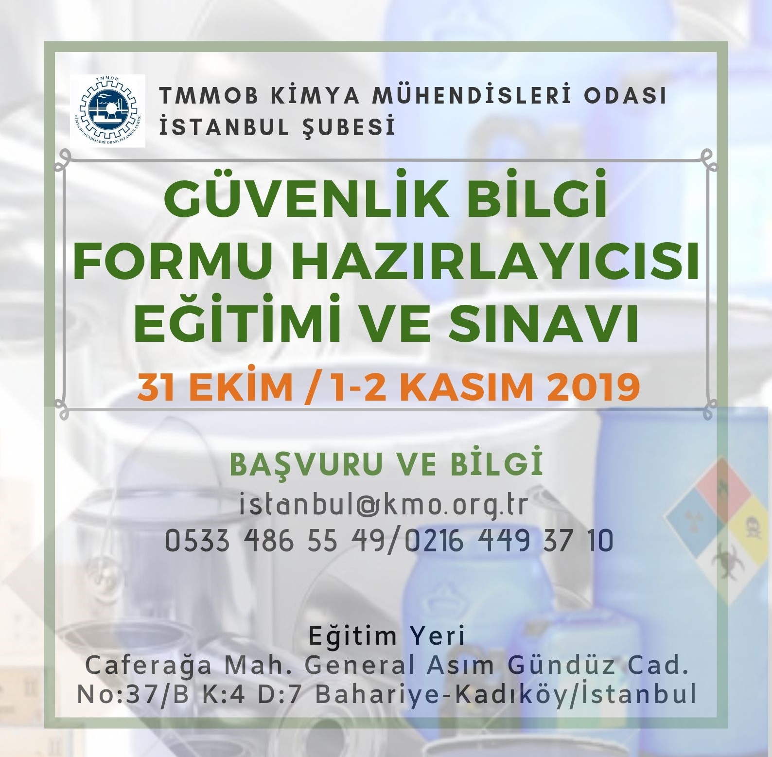 Şubemiz eğitim salonunda 31 Ekim /1-2 Kasım 2019 tarihlerinde Güvenlik Bilgi Formu Hazırlayıcısı Eğitimi ve Sınavı düzenlenecektir. Eğitim ile ilgili detayı ve eğitim başvuru formunu aşağıda bulabilirsiniz.