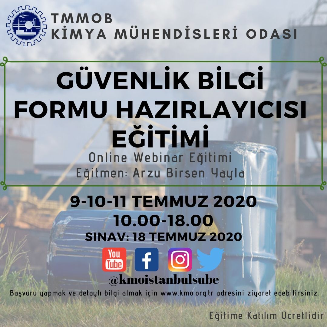 09-10-11 Temmuz 2020 tarihlerinde Güvenlik Bilgi Formu Hazırlayıcısı Eğitimimiz Zoom programı üzerinden online olarak düzenlenecektir. Eğitim ile ilgili detayı ve eğitim başvuru formunu ekte bulabilirsiniz. Eğitime katılmak isteyen üyelerimizin, başvuru formunu doldurarak istenilen diğer evraklarla birlikte guney@kmo.org.tr adresine e-mail göndermelerini rica ederiz.
