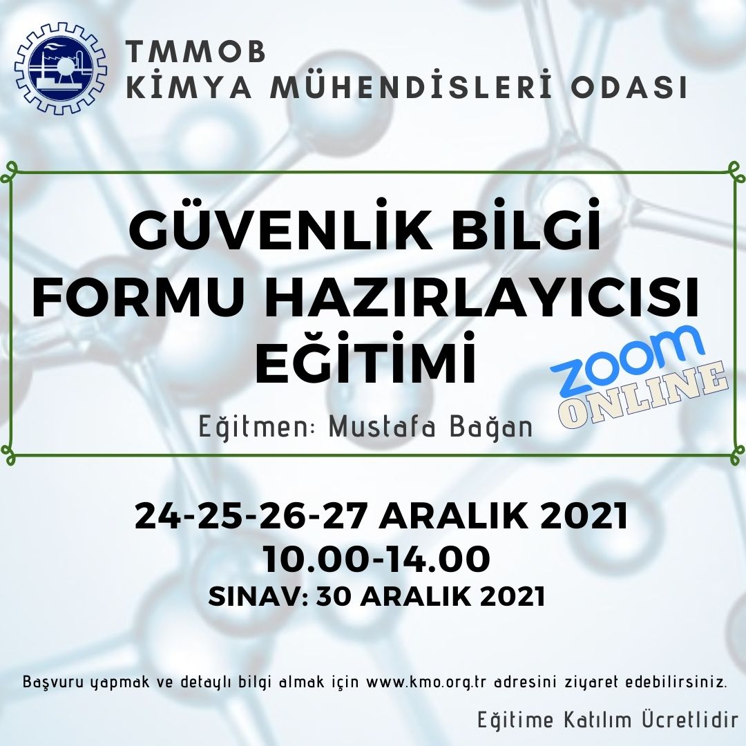Odamız tarafından, 24-25-26-27 Aralık 2021 tarihlerinde "GÜVENLİK BİLGİ FORMU HAZIRLAYICISI EĞİTİMİ" düzenlenecektir. Zoom programı üzerinden online olarak yapılacak eğitim ile ilgili detaylı bilgi ekte/aşağıda yer almaktadır. Eğitime katılmak isteyenlerin, başvuru formunu doldurarak istanbul@kmo.org.tr e-posta adresine göndermeleri rica olunur.