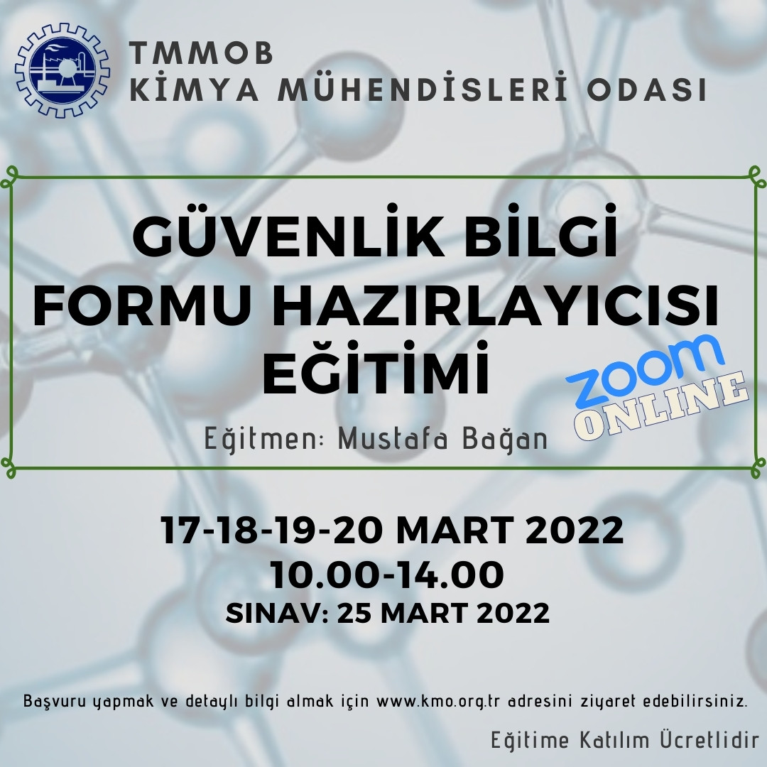 17-18-19-20 Mart 2022 tarihlerinde Odamız tarafından GÜVENLİK BİLGİ FORMU HAZIRLAYICISI EĞİTİMİ online olarak düzenlenecektir.