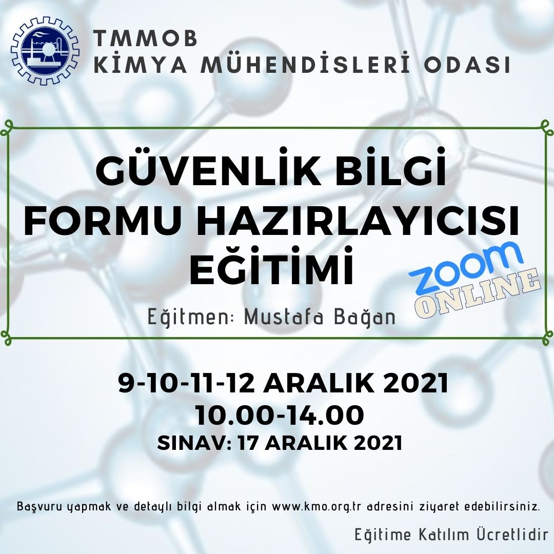 TMMOB Kimya Mühendisleri Odası olarak, 09-10-11-12 Aralık 2021 tarihlerinde GÜVENLİK BİLGİ FORMU HAZIRLAYICISI EĞİTİMİni düzenleyeceğiz. Zoom programı üzerinden online olarak yapılacak eğitim ile ilgili detaylı bilgi ekte/aşağıda yer almaktadır. Eğitime katılmak isteyenlerin, başvuru formunu doldurarak istanbul@kmo.org.tr e-posta adresine göndermeleri rica olunur.