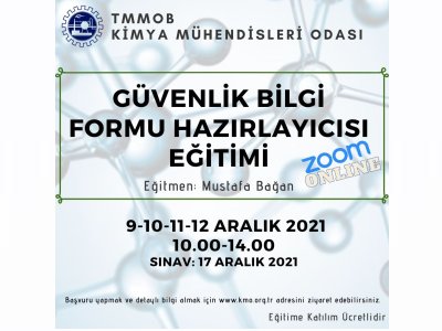TMMOB Kimya Mühendisleri Odası, 09-10-11-12 Aralık 2021 tarihlerinde GÜVENLİK BİLGİ FORMU HAZIRLAYICISI EĞİTİMİni düzenleyecektir. Zoom programı üzerinden online olarak yapılacak eğitim ile ilgili detaylı bilgi ekte/aşağıda yer almaktadır. Eğitime katılmak isteyenlerin, başvuru formunu doldurarak bursa@kmo.org.tr e-posta adresine göndermeleri rica olunur.