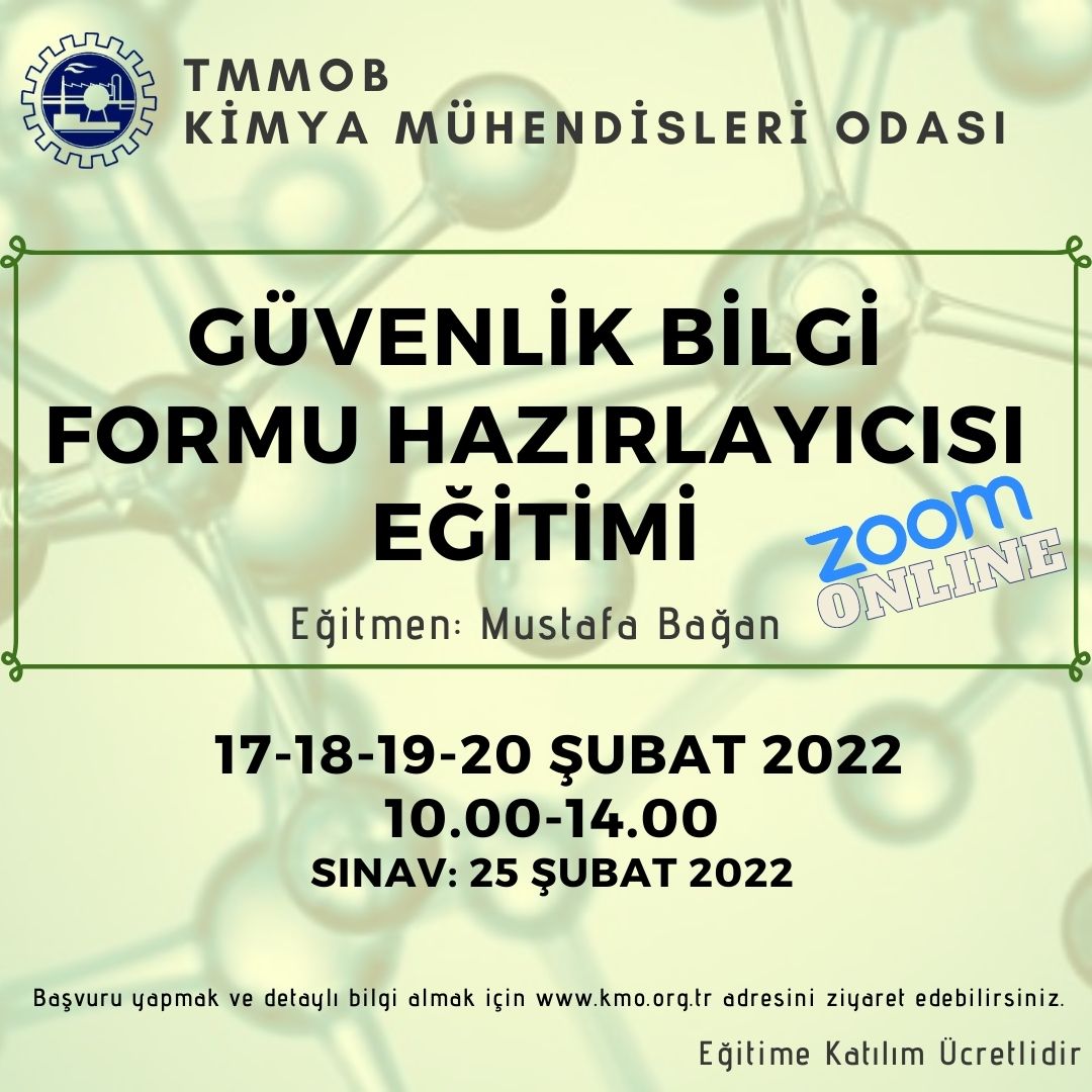 Odamız tarafından, 17-18-19-20 Şubat 2022 tarihlerinde GÜVENLİK BİLGİ FORMU HAZIRLAYICISI EĞİTİMİ düzenlenecektir. Zoom programı üzerinden online olarak yapılacak eğitim ile ilgili detaylı bilgi ekte/aşağıda yer almaktadır. Eğitime katılmak isteyenlerin, başvuru formunu doldurarak istanbul@kmo.org.tr e-posta adresine göndermeleri rica olunur.