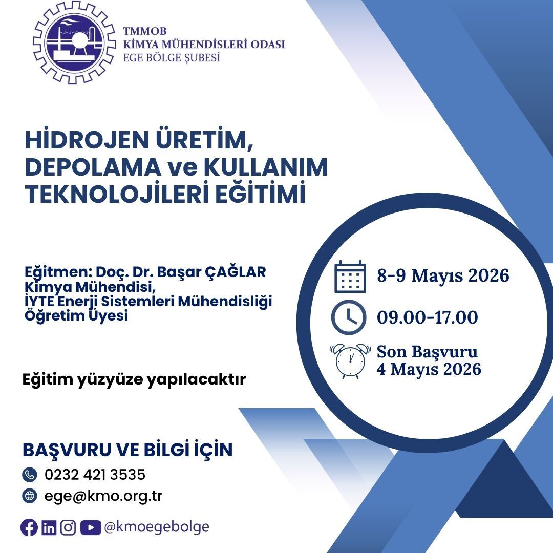8-9 Mayıs 2026 tarihlerinde 09.00-17.00 saatleri arasında, " HİDROJEN ÜRETİM, DEPOLAMA ve KULLANIM TEKNOLOJİLERİ EĞİTİMİ " İzmir’de yüzyüze düzenlenecektir.