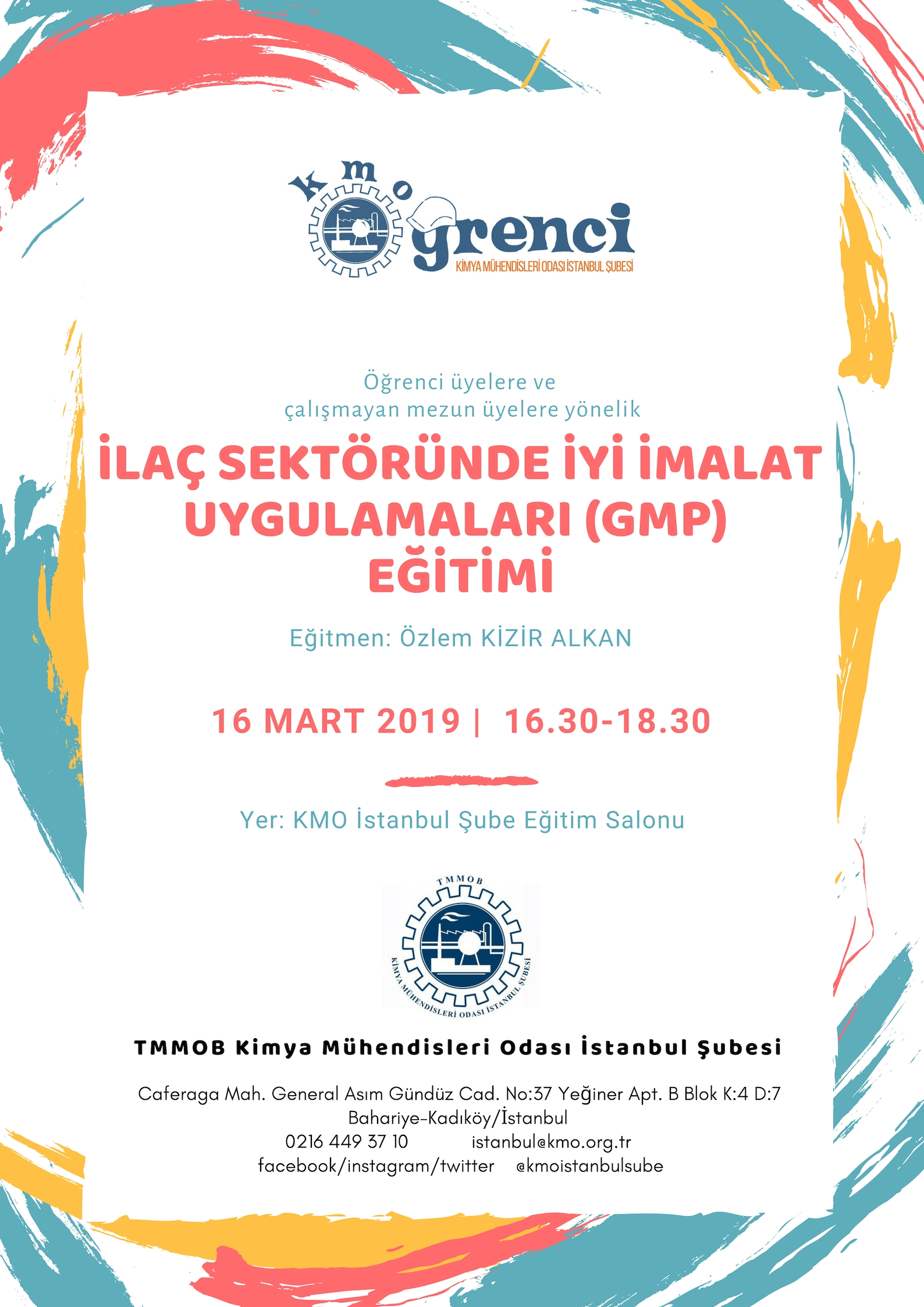 16 Mart 2019 Cumartesi günü, saat:16.30-18.30 arasında öğrenci komisyonumuz üyelerine ve çalışmayan mezun üyelerimize yönelik ücretsiz olarak `İlaç Sektöründe İyi İmalat Uygulamaları (GMP) Eğitimi" gerçekleşecektir.