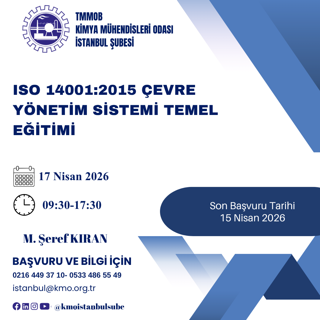 17 Nisan 2026 tarihinde Zoom programı üzerinden online olarak ISO 14001:2015 ÇEVRE YÖNETİM SİSTEMİ TEMEL EĞİTİMİ düzenlenecektir. Eğitim ile ilgili detayı ve eğitim başvuru formunu aşağıda bulabilirsiniz. Eğitime katılmak isteyen üyelerimizin, başvuru formunu doldurarak istanbul@kmo.org.tr adresine göndermeleri gerekmektedir.