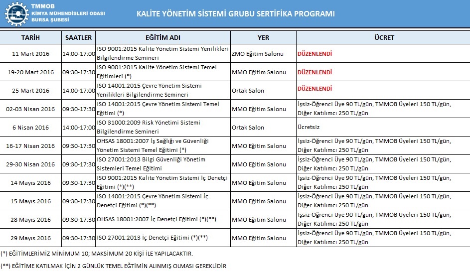 Şubemiz tarafından 11 Mart 2016 – 29 Mayıs 2016 tarihleri arasında ekte gönderilen "Kalite Yönetim Sistemi Eğitim Programı" dahilinde, 2-3 Nisan 2016 tarihinde "ISO 14001:2015 Çevre Yönetim Sistemi Temel Eğitimi" düzenlenecektir. Eğitme katılım talebinizi 1 Nisan 2016 Cuma gününe kadar şubemize bildirmenizi rica ederiz.