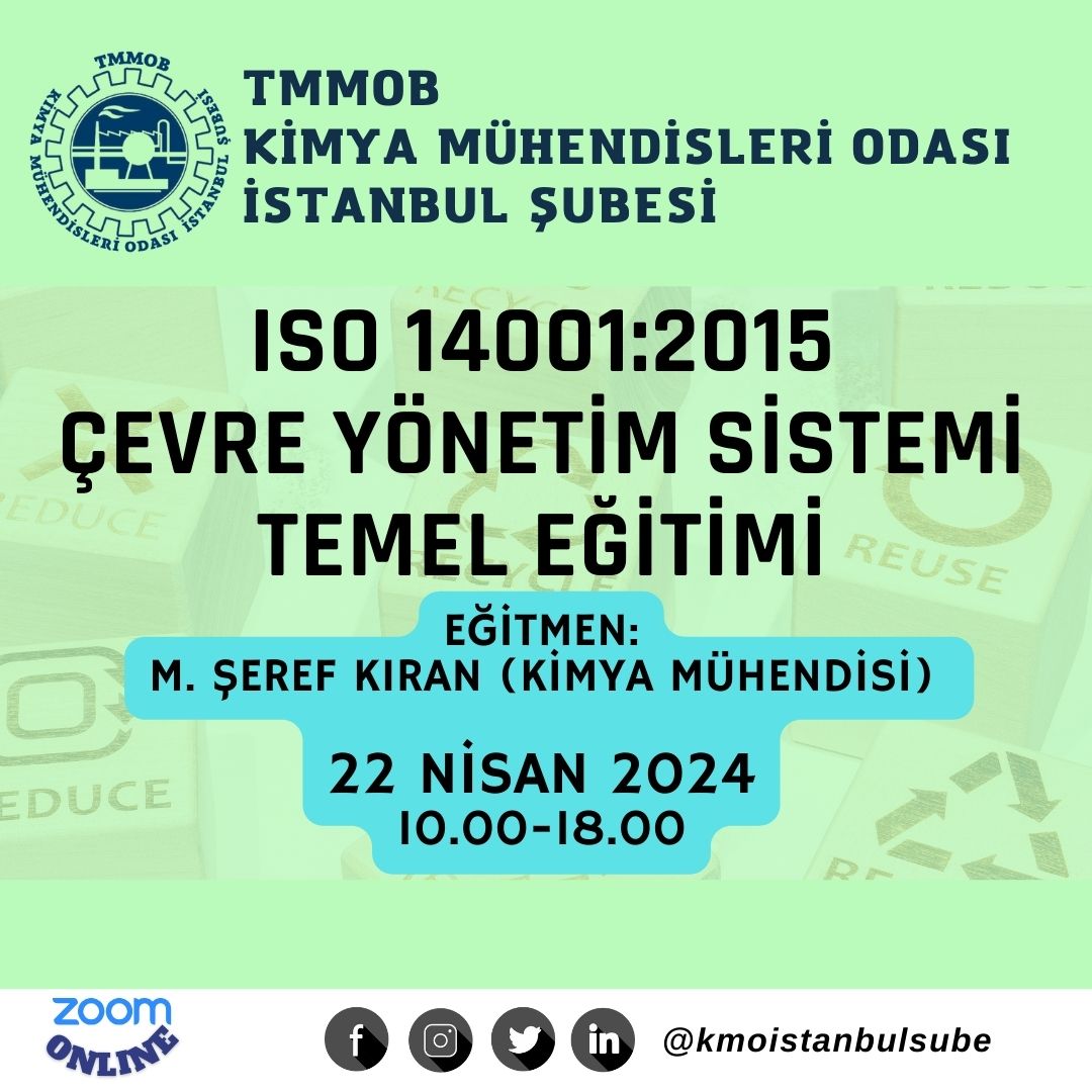 Odamız tarafından 22 Nisan 2024 tarihinde ISO 14001:2015 Çevre Yönetim Sistemi Temel Eğitimi online olarak zoom programı üzerinde düzenlenecektir.