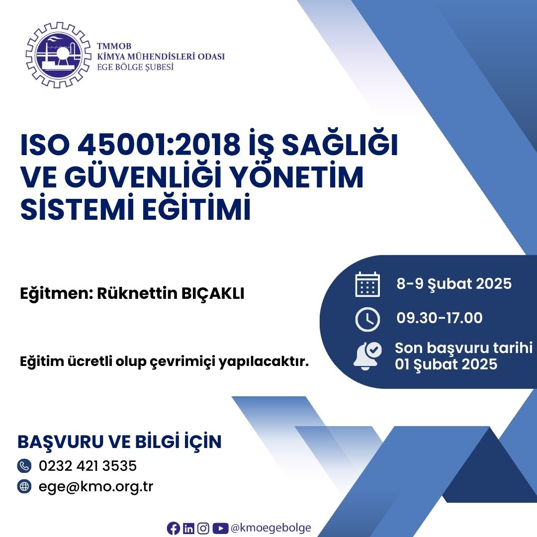 TMMOB Kimya Mühendisleri Odası Eskişehir Bölge Temsilciliği organizasyonuyla, 08-09 Şubat 2025 tarihlerinde " ISO 45001:2018 İŞ SAĞLIĞI VE GÜVENLİĞİ YÖNETİM SİSTEMİ EĞİTİMİ" zoom programı üzerinden online olarak düzenlenecektir. Eğitim ile ilgili detaylı bilgi aşağıda yer almakta olup eğitime katılmak isteyenlerin, ekte gönderilen başvuru formunu doldurup istenen belgeler ile birlikte 01 Şubat 2025 tarihine kadar ege@kmo.org.tr adresine göndermelerini rica ederiz.