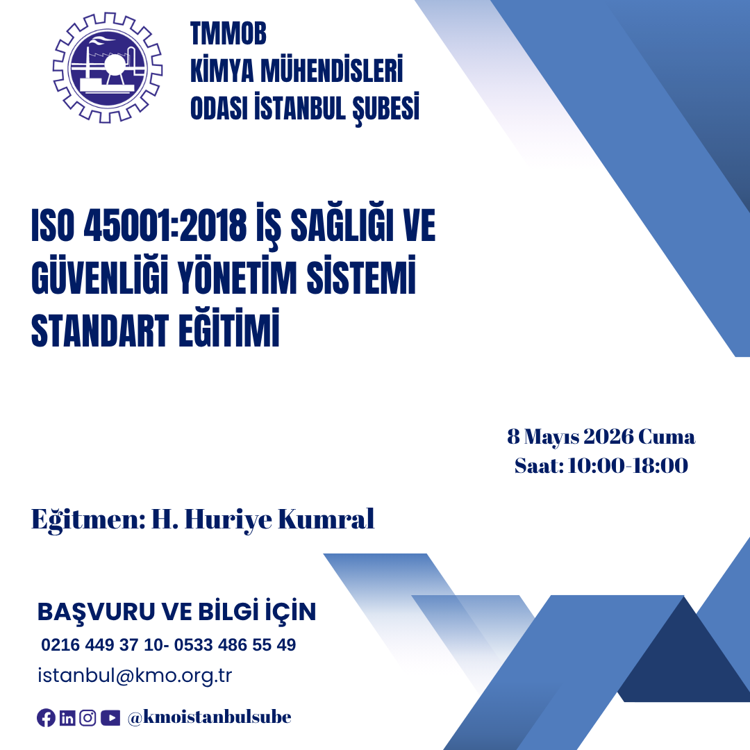 TMMOB Kimya Mühendisleri Odası olarak, 8 Mayıs 2026 tarihinde ISO 45001:2018 İŞ SAĞLIĞI VE GÜVENLİĞİ YÖNETİM SİSTEMİ STANDART EĞİTİMİ online olarak zoom programı üzerinden düzenlenecektir. Eğitim ile ilgili detaylı bilgi aşağıda yer almakta olup eğitim başvuru formunu ekte bulabilirsiniz. Eğitime katılmak isteyenlerin, başvuru formunu doldurarak 5 Mayıs 2026 tarihine kadar istanbul@kmo.org.tr adresine göndermelerini rica ederiz.