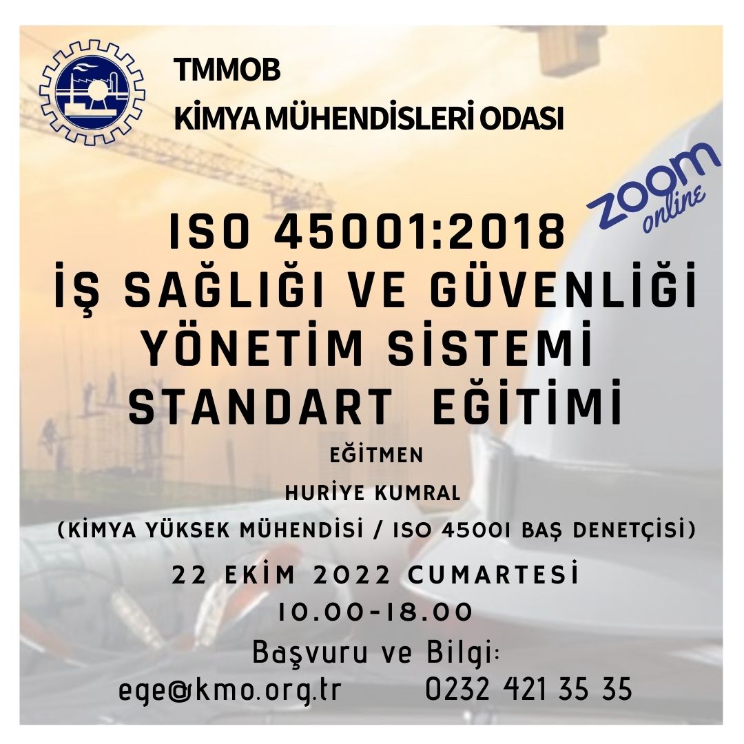 22 Ekim 2022 tarihinde ISO 45001:2018 İŞ SAĞLIĞI VE GÜVENLİĞİ YÖNETİM SİSTEMİ STANDART EĞİTİMİ online olarak zoom programı üzerinden düzenlenecektir. Eğitim ile ilgili detaylı bilgi aşağıda yer almakta olup eğitim başvuru formunu ekte bulabilirsiniz.