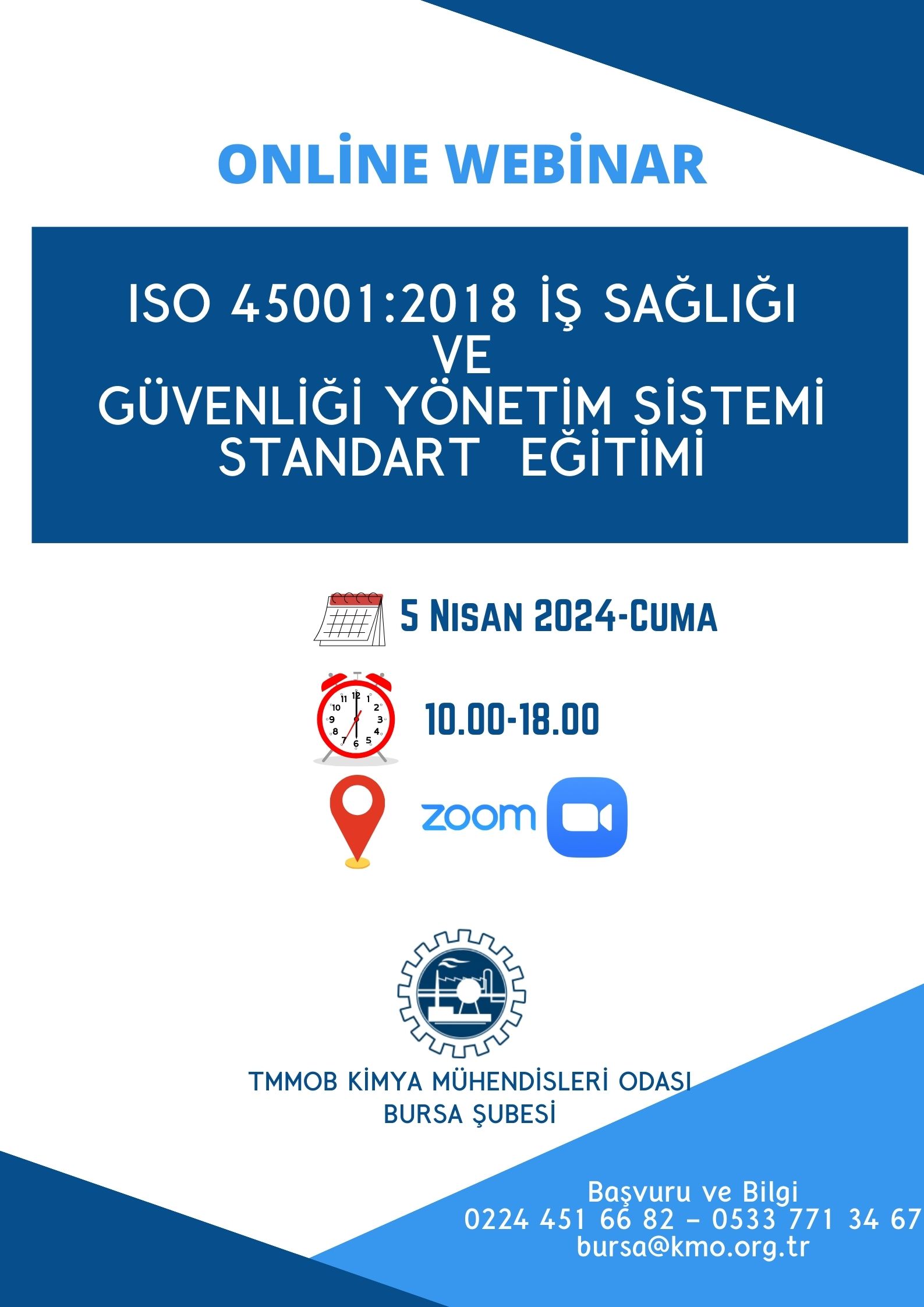 Odamız tarafından 5 Nisan 2024 Cuma günü ISO 45001:2018 İş Sağlığı ve Güvenliği Yönetim Sistemi Standart Eğitimi online olarak zoom programı üzerinden düzenlenecektir. Eğitim ile ilgili detaylı bilgi aşağıda yer almakta olup eğitim başvuru formunu ekte dosyalar kısmında bulabilirsiniz. Eğitime katılmak isteyen meslektaşlarımızın ekte yer alan başvuru formunu doldurarak 2 Nisan 2024 tarihine kadar bursa@kmo.org.tr e-mail adresine göndermelerini rica ederiz.