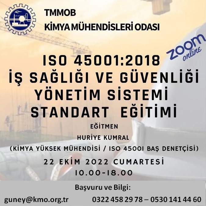 22 Ekim 2022 Cumartesi tarihinde "ISO 45001:2018 İş Sağlığı ve Güvenliği Yönetim Sistemi Standart Eğitimi" online olarak zoom programı üzerinde düzenlenecektir. Eğitim ile ilgili detaylı bilgi aşağıda yer almakta olup eğitim başvuru formunu ekte dosyalar kısmında bulabilirsiniz. Eğitime katılmak isteyenlerin ekte yer alan başvuru formunu doldurarak guney@kmo.org.tr e-mail adresine göndermelerini rica ederiz.