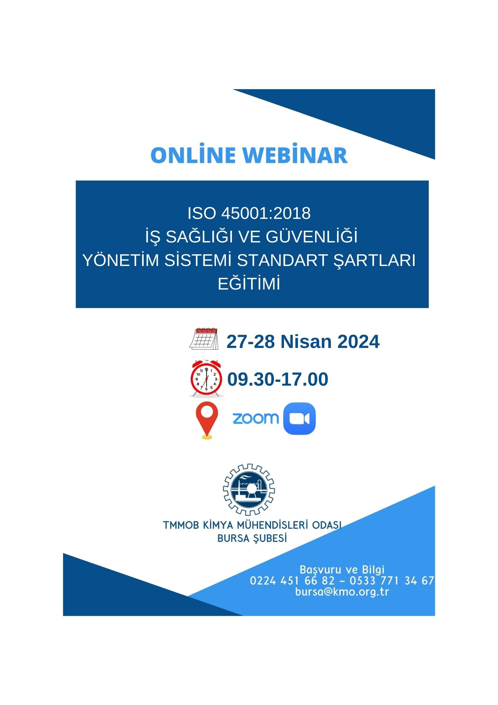 27-28 Nisan 2024 tarihlerinde 09.30-17.00 saatleri arasında, Kimya Mühendisleri Odası Eskişehir Bölge Temsilciliğimiz organizasyonu ile, "ISO 45001:2018 İŞ SAĞLIĞI VE GÜVENLİĞİ YÖNETİM SİSTEMİ STANDART ŞARTLARI EĞİTİMİ" Zoom programı üzerinden online olarak gerçekleşecektir. Eğitim ile ilgili detaylı bilgi aşağıda olup eğitime katılmak isteyenlerin, ekte gönderilen başvuru formunu doldurup istenen belgeler ile birlikte 24 Nisan 2024 tarihine kadar, bursa@kmo.org.tr adresine göndermelerini rica ederiz.