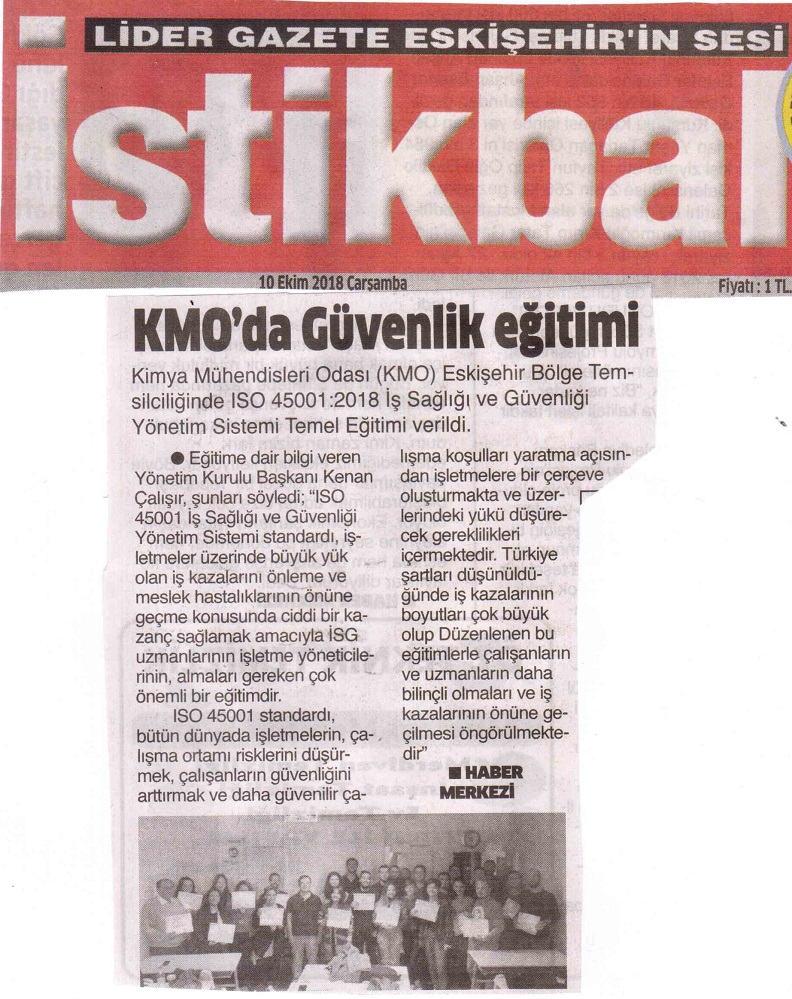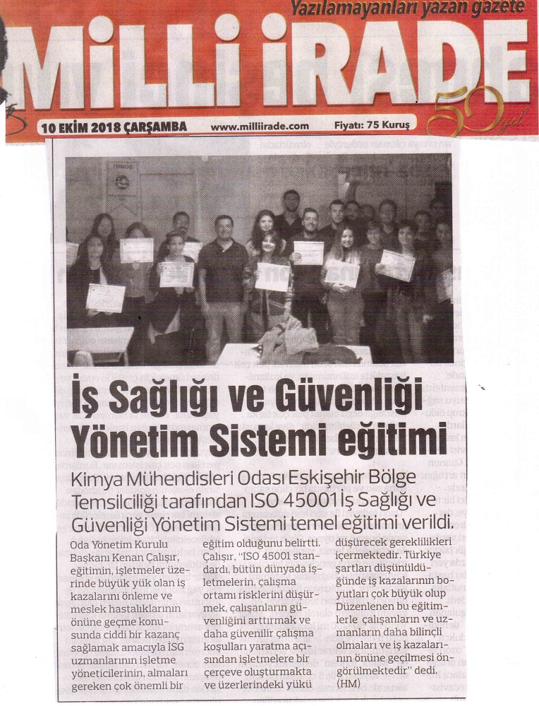 Yönetim Sistemleri Uzmanı,Başdenetçi, Kimya Mühendisi Rüknettin Bıçaklı`nın eğitmenliğinde 6-7 Ekim 2018 tarihleri arasında düzenlediğimiz eğitime 26 katılımcı iştirak etmiş ve eğitim sonunda tüm katılımcılara EĞİTİM SERTİFİKASI verilmiştir.