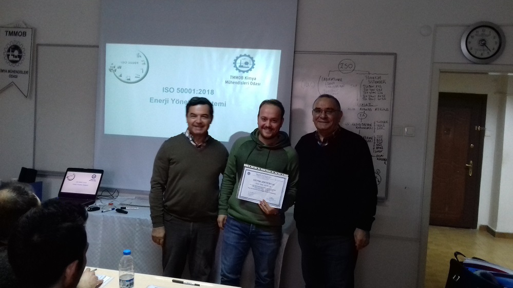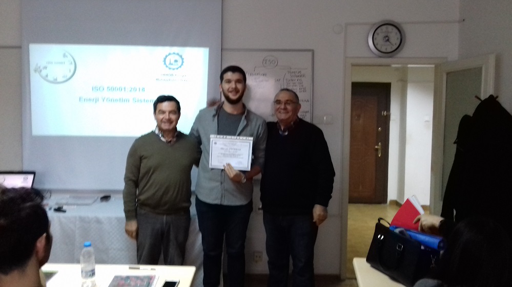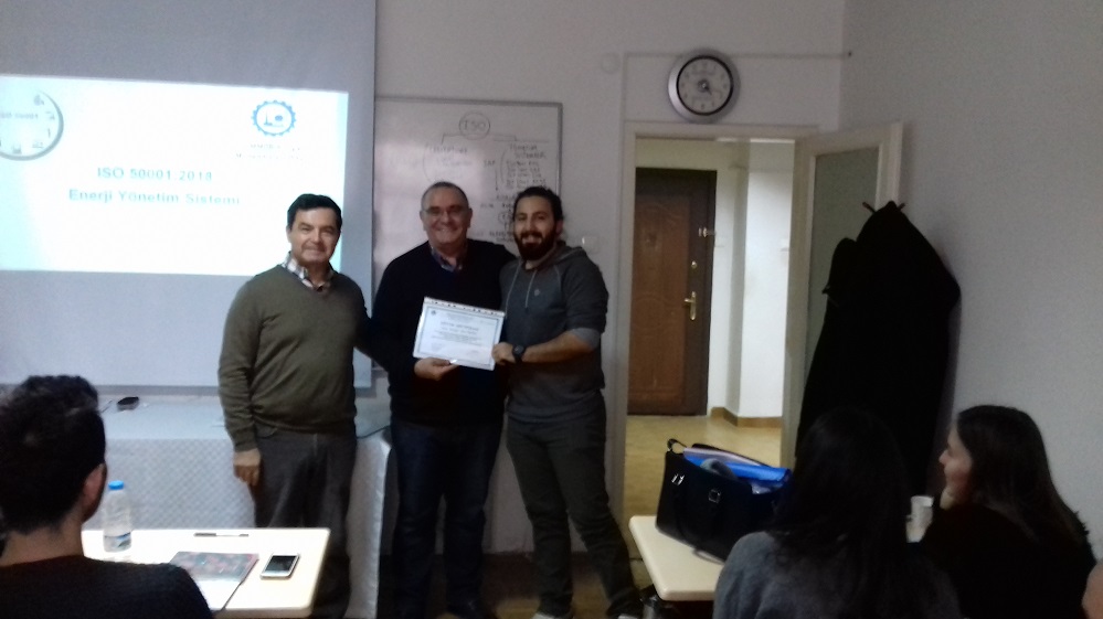 Üretim ve hizmet sektöründe faaliyet gösteren, faaliyetleri için enerji tüketen tüm kurum ve kuruluşlarda enerji tasarrufu sağlamak ve enerji verimliliğini arttırmak için ISO 50001 Enerji Yönetim Sistemi kurulması hakkında yetkinlik kazanmak amacıyla 8-9 ARALIK 2018 tarihlerinde Bölge Temsilciliğimizde düzenlenen Eğitime 29 kişi katılmış, eğitim sonunda Y.K Başkanımız Kenan ÇALIŞIR bu önemli eğitimde katılımcılarımıza değerli bilgilerini paylaşan Eğitmenimiz Rüknettin BIÇAKLI`ya Teşekkür belgesi takdim etmiştir. Tüm katılımcılarımıza Eğitim Sertifikaları verilmiştir.