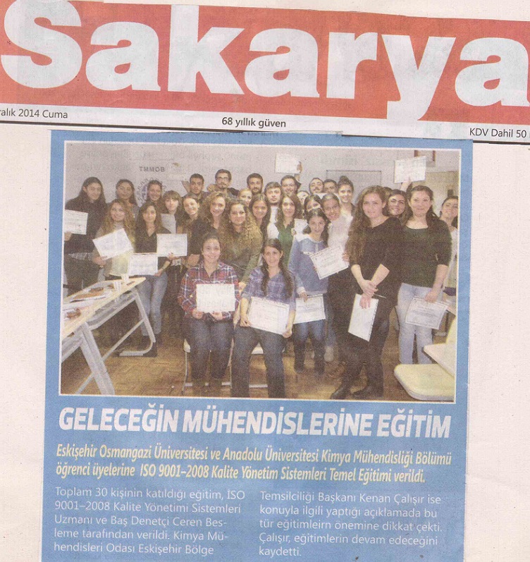 29-30 Kasım 2014 tarihlerinde Eskişehir Osmangazi Üniversitesi ve Anadolu üniversitesi Kimya Mühendisliği Bölümü öğrenci üyelerimize ve üyelerimize, ISO 9001–2008 Kalite Yönetim Sistemleri Temel Eğitimi verilmiştir. Eğitime toplam 30 kişi katılmıştır. Eğitimde konuları İSO 9001–2008 Kalite Yönetimi Sistemleri Uzmanı ve Baş Denetçi Ceren BESLEME anlatmıştır.