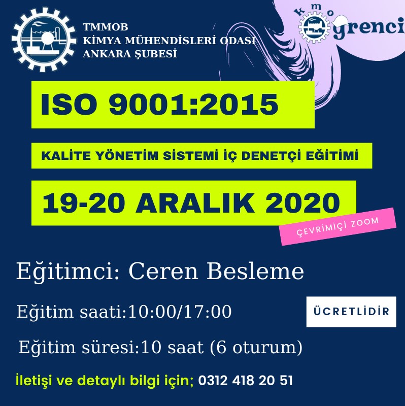 Odamız tarafından 19-20 Aralık 2020 tarihlerinde ISO 9001/2015 Kalite Yönetim Sistemi İç Denetçi Eğitimi yapılacaktır. Eğitim ücreti öğrencilere 160 TL/2 gün, çalışmayan üyelere 280 TL/2 gün, çalışan üyelere 350 TL/2 gün, Dış Katılımcı (TMMOB Üyesi olmayan) 500 TL/2 gün olarak belirlenmiştir.