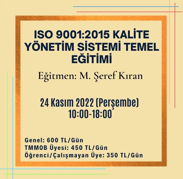 Odamız tarafından 24 Kasım 2022 tarihinde ISO 9001:2015 KALİTE YÖNETİM SİSTEMİ TEMEL EĞİTİMİ online olarak zoom programı üzerinde düzenlenecektir. Eğitim ile ilgili detaylı bilgi aşağıda yer almakta olup eğitim başvuru formunu ekte dosyalar kısmında bulabilirsiniz.