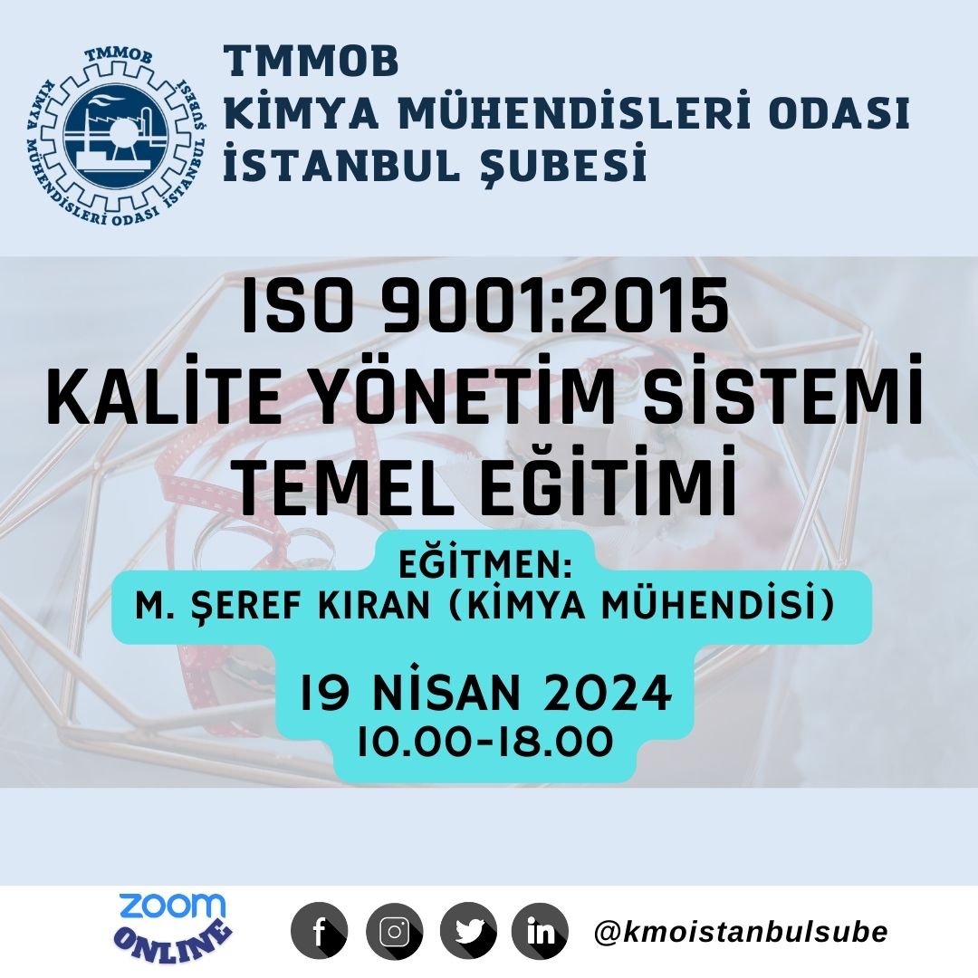 Şubemiz tarafından 19 Nisan 2024 tarihinde ISO 9001:2015 Kalite Yönetim Sistemi Temel Eğitimi online olarak zoom programı üzerinde düzenlenecektir