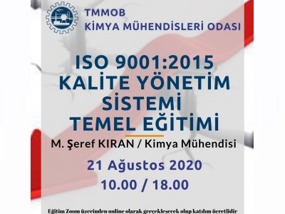 21 Ağustos 2020 tarihlerinde ISO 9001:2015 KALİTE YÖNETİM SİSTEMİ TEMEL EĞİTİMİ online webinar eğitimi düzenlenecektir. Eğitim ile ilgili detayı ve başvuru formunu ekte dosyalar kısmında bulabilirsiniz.
