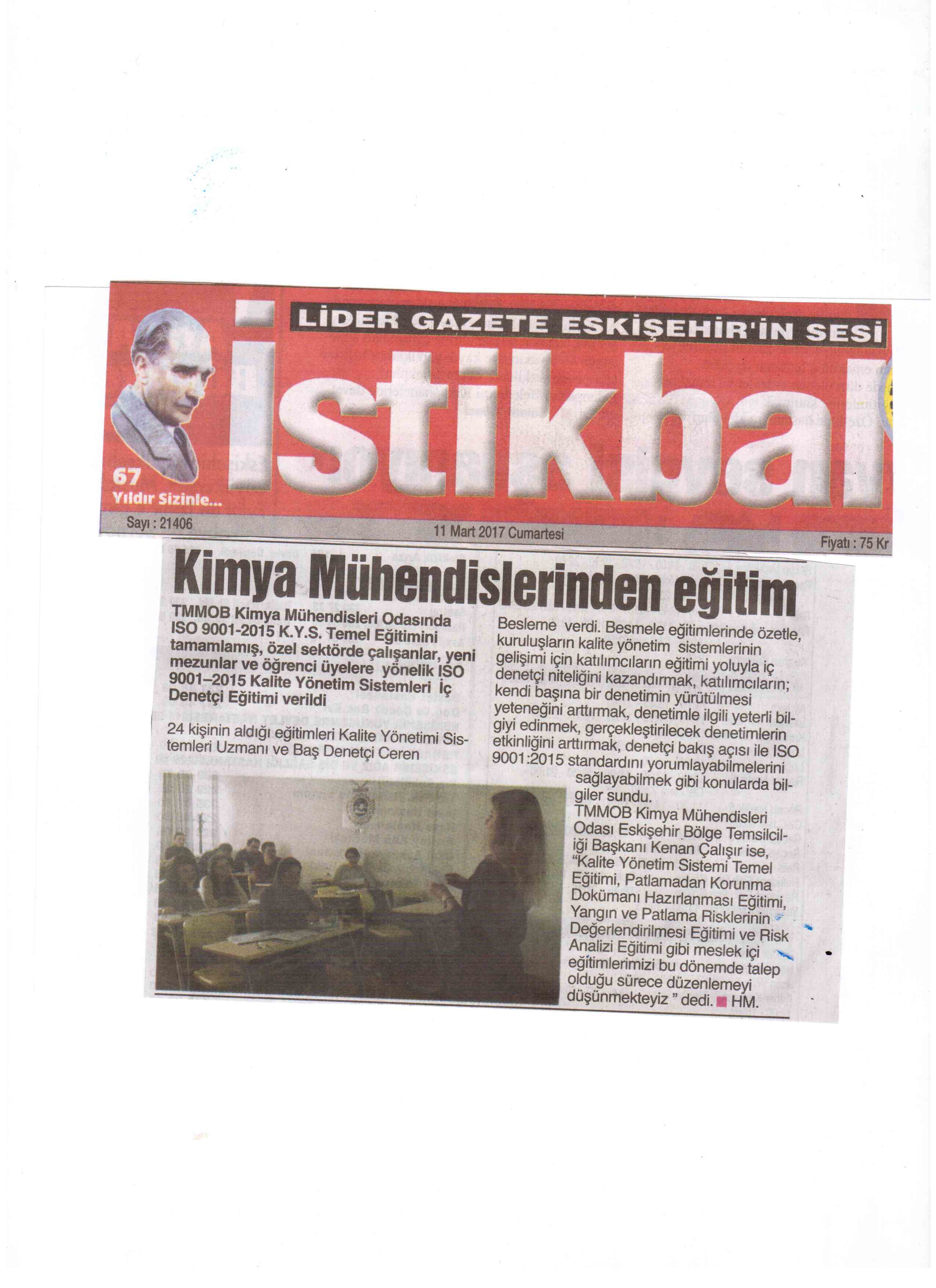 25-26 ŞUBAT 2017 tarihlerinde daha önce ISO 9001-2015 Kalite Yönetim Sistemleri Temel Eğitimini tamamlamış olan, öğrenci ve mezun üyelerimize yönelik ISO 9001-2015 Kalite Yönetim Sistemleri İç Denetçi Eğitimi verilmiştir. Eğitim, ISO 9001-2015 Kalite Yönetimi Sistemleri Uzmanı ve Baş Denetçisi Kimya Mühendisi Ceren BESLEME tarafından verilmiştir.Eğitime 24 kişi katılmıştır.