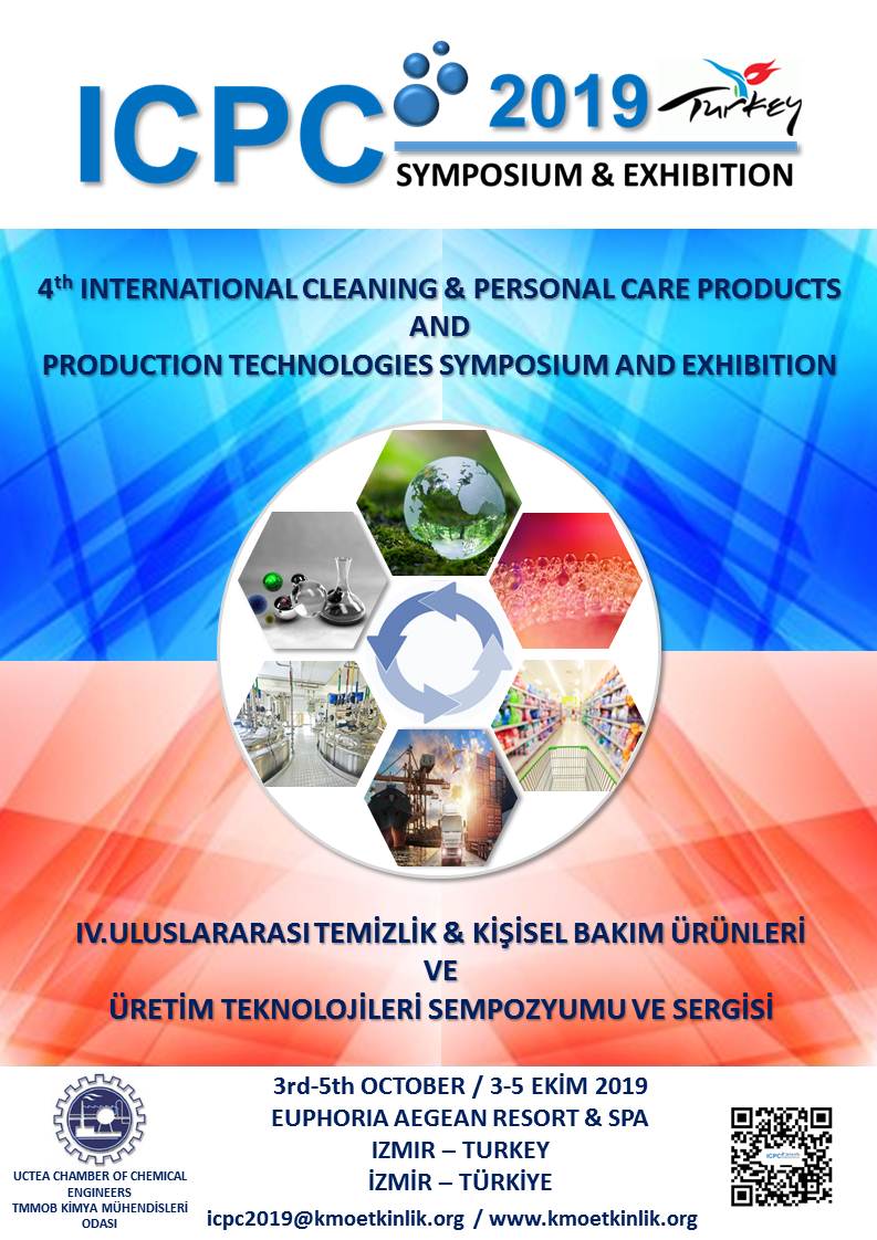 TMMOB Kimya Mühendisleri Odası Ege Bölge Şubesi Koordinatörlüğünde "IV. Uluslararası Temizlik & Kişisel Bakım Ürünleri Ve Üretim Teknolojileri Sempozyumu Ve Sergisi" 26-28 Eylül 2019 tarihlerinde Euphoria Egean Hotel Seferihisar -İzmir`de gerçekleştirilmiştir.