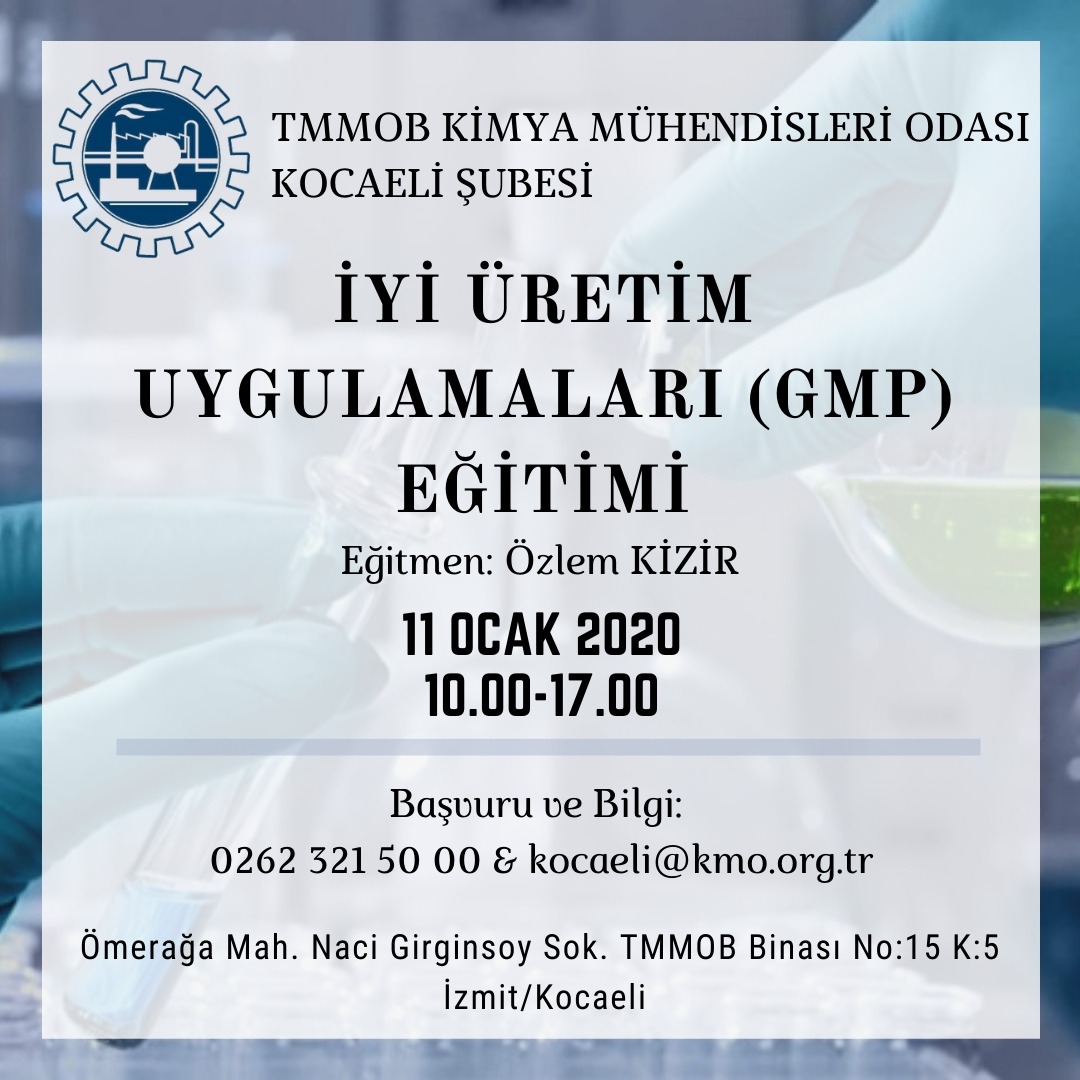 Değerli Üyemiz, Ekteki İyi Üretim Uygulamaları (GMP) eğitimini, çevrenizdeki kişi ve/veya kuruluşlara duyurmanızı rica ederiz. Saygılarımızla, TMMOB Kimya Mühendisleri Odası Kocaeli Şubesi