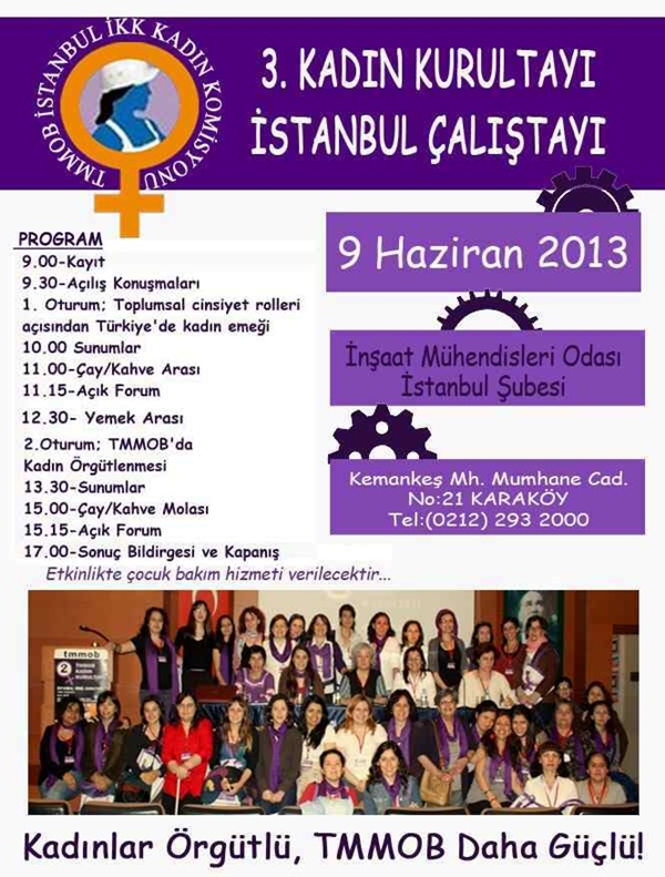 Bu yıl Kasım ayında gerçekleşecek olan TMMOB 3.Kadın Kurultayı öncesi İstanbul İKK Kadın Komisyonu tarafından düzenlenen İstanbul Yerel Çalıştayı için 9 Haziranda bir araya geliyoruz. "Toplumsal Cinsiyet Rolleri Açısından Türkiyede Kadın Emeği" ve "TMMOBde Kadın Örgütlenmesi" başlıkları altında 2 oturumda gerçekleşecek çalıştayda, çocuk bakım hizmeti de verilecektir. Etkinlik afişi aşağıdadır.