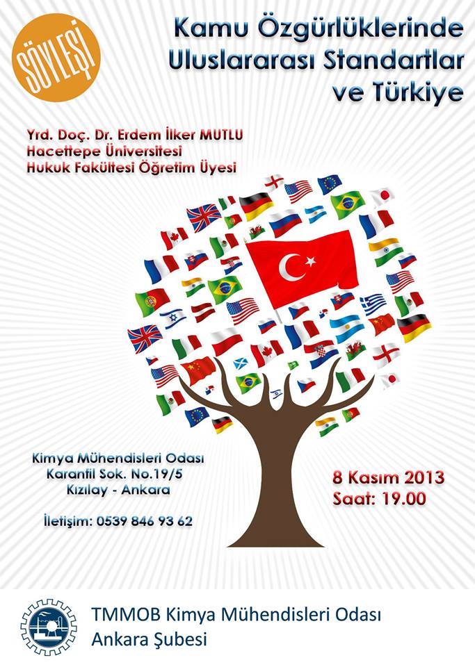 8 Kasım Cuma saat 19:00`da Kimya Mühendisleri Odası Ankara Şubesi Toplantı Salonu`nda Dr. Erdem İlker MUTLU`nun konuşmacı olarak katılacağı ``Kamu Özgürlüklerinde Uluslararası Standartlar ve Türkiye `` konulu söyleşiye siz değerli üyelerimizin katılımını bekliyoruz.