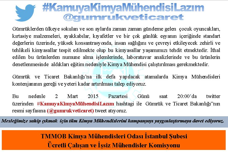 Bir süredir çalışmalarına devam eden komisyonumuz meslek alanımızla ilgili olan Bakanlıklara "Kamuda Kimya Mühendisi İstihdamı"nın önemini gerekçeli yazılarla iletme kararı almış ve ilk olarak Gümrük ve Ticaret Bakanlığı ile ilgili çalışmayı başlatmıştı. Bakanlığa şubemiz kanalıyla ileitlen 24.02.2015 tarih ve 58 no‘lu yazı ve akabinde sosyal medyada 2 Mart 2015 tarihinde başlatılan #KamuyaKimyaMühendisiLazım kampanyası ile atama bekleyen meslektaşlarımızın sesini duyurmaya çalıştı. Gümrük ve Ticaret Bakanlığı 17474625/900 sayılı yazı ile ilgili yazımıza istinaden "bundan sonraki çalışan alımlarında mezkur yazımızda bahsi geçen açıklamaları da dikkkate alacaklarını" bildirmişlerdir.