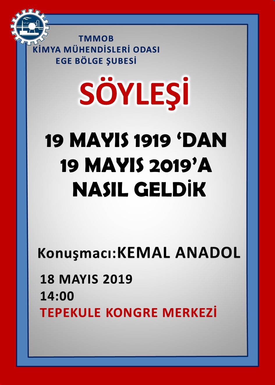 18 Mayıs 2019 Cumartesi günü 14.00-17.00 saatlerinde İzmir eski Milletvekili Sn. K. Kemal ANADOLun sunacağı "19 Mayıs 1919dan 2019a Nasıl Geldik"konulu Söyleşi düzenlenecektir.