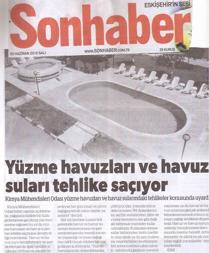 `Kimya Mühendisleri Odasının Yüzme Havuzları ve Havuz Suları Tehlike Saçıyor ` Başlıklı yazısı Eskişehir Yerel Basınında yer aldı