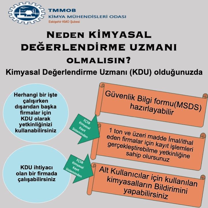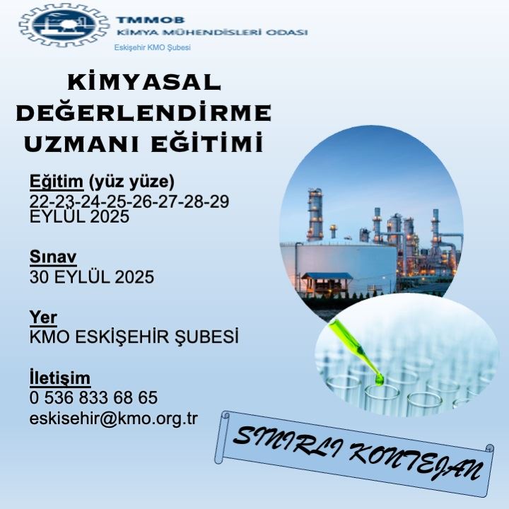 TMMOB Kimya Mühendisleri Odası Eskişehir Bölge Temsilciliği tarafından, T.C. Çevre, Şehircilik ve İklim Değişikliği Bakanlığı tarafından 23 Haziran 2017 tarih ve 30105 (Mükerrer) sayılı Resmi Gazete` de yayımlanmış olan "Kimyasalların Kaydı, Değerlendirilmesi, İzni ve Kısıtlanması (KKDİK) Hakkında Yönetmeliği" kapsamında 22-23-24-25-26-27-28-29 EYLÜL 2025 tarihlerinde KİMYASAL DEĞERLENDİRME UZMANI (KDU) EĞİTİMİ programlanmıştır.