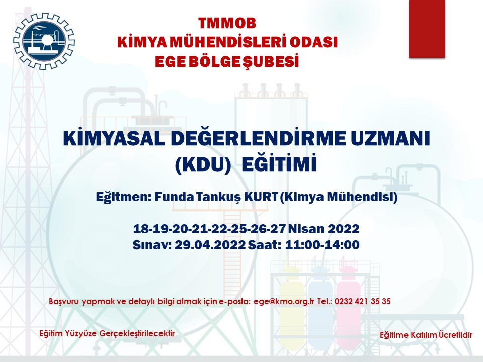 TMMOB Kimya Mühendisleri Odası Ege Bölge Şubesi olarak, T.C. Çevre ve Şehircilik Bakanlığı tarafından 23 Haziran 2017 tarih ve 30105 (Mükerrer) sayılı Resmi Gazete` de yayımlanmış olan "Kimyasalların Kaydı, Değerlendirilmesi, İzni ve Kısıtlanması (KKDİK) Hakkında Yönetmeliği" kapsamında 18-19-20-21-22, 25-26-27 Nisan 2022 tarihlerinde KİMYASAL DEĞERLENDİRME UZMANI (KDU) EĞİTİMİ programlanmıştır.