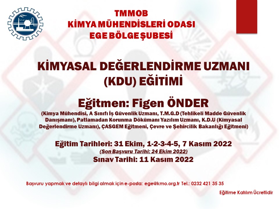 TMMOB Kimya Mühendisleri Odası Ege Bölge Şubesi olarak, T.C. Çevre ve Şehircilik Bakanlığı tarafından 23 Haziran 2017 tarih ve 30105 (Mükerrer) sayılı Resmi Gazete` de yayımlanmış olan "Kimyasalların Kaydı, Değerlendirilmesi, İzni ve Kısıtlanması (KKDİK) Hakkında Yönetmeliği" kapsamında 31 Ekim, 1-2-3-4-5 Kasım, 7 Kasım 2022 tarihlerinde KİMYASAL DEĞERLENDİRME UZMANI (KDU) EĞİTİMİ programlanmıştır.