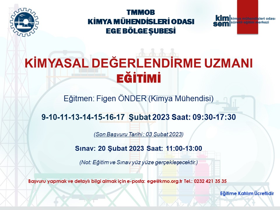 TMMOB Kimya Mühendisleri Odası Ege Bölge Şubesi olarak, T.C. Çevre ve Şehircilik Bakanlığı tarafından 23 Haziran 2017 tarih ve 30105 (Mükerrer) sayılı Resmi Gazete` de yayımlanmış olan "Kimyasalların Kaydı, Değerlendirilmesi, İzni ve Kısıtlanması (KKDİK) Hakkında Yönetmeliği" kapsamında 9-10-11-13-14-15-16-17 ŞUBAT 2023 tarihlerinde KİMYASAL DEĞERLENDİRME UZMANI (KDU) EĞİTİMİ programlanmıştır.