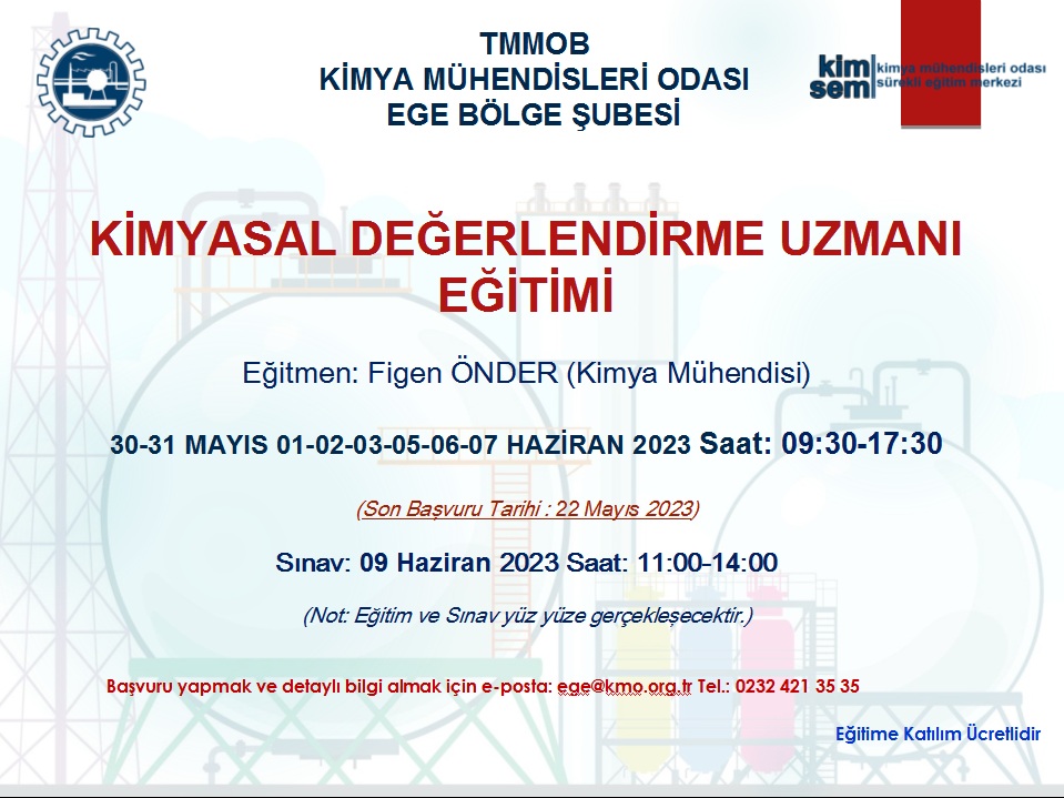 TMMOB Kimya Mühendisleri Odası Ege Bölge Şubesi olarak, T.C. Çevre ve Şehircilik Bakanlığı tarafından 23 Haziran 2017 tarih ve 30105 (Mükerrer) sayılı Resmi Gazete` de yayımlanmış olan "Kimyasalların Kaydı, Değerlendirilmesi, İzni ve Kısıtlanması (KKDİK) Hakkında Yönetmeliği" kapsamında 30-31 MAYIS 01-02-03-05-06-07 HAZİRAN 2023 tarihlerinde KİMYASAL DEĞERLENDİRME UZMANI (KDU) EĞİTİMİ programlanmıştır.